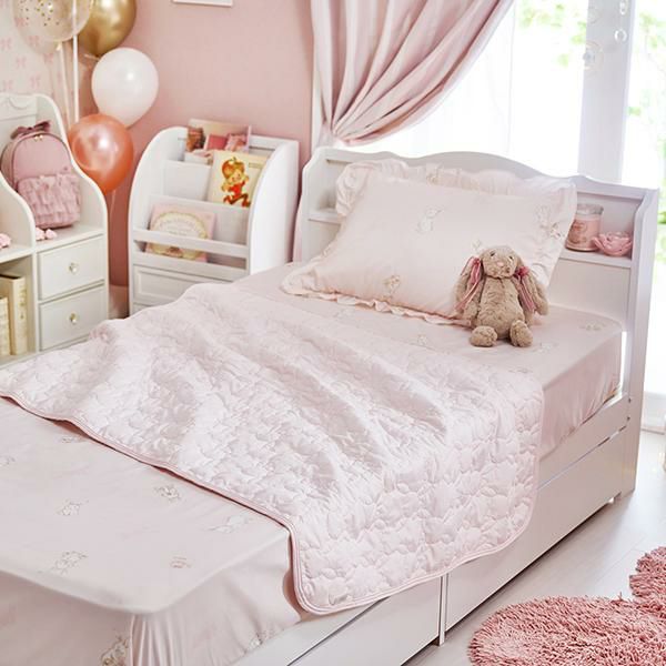 うさぎ柄は、キュートなミルキーカラーのピンク地に、2種類のかわいいうさぎをモチーフにしたステッチになっています。淡く優しいピンクカラーで、どんなお部屋でもかわいくマッチする色味になっています♥ また同じくうさぎをモチーフにした、人気のうさぎ柄ベッドカバーにも似合うデザインになっているので、ぜひ一緒に合わせて使ってみてくださいね☆