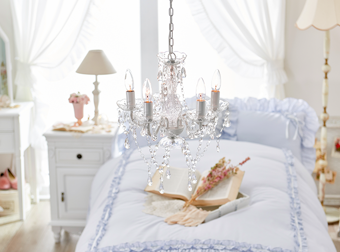5灯シャンデリアです。美しいデザインと細やかなカットを施したパーツにより、お部屋がエレガントな空間に!ピンク・シルバー・ホワイトの3色展開です。