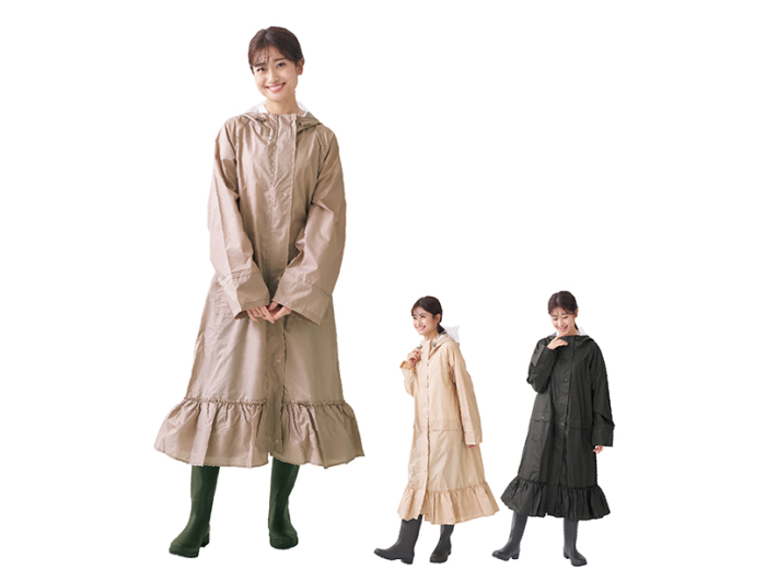 - 自転車に乗る際に便利な機能を備えたレインコート。ロング丈なので足元まで雨からカバーします。大きな透明バイザーとハンドルごとカバーできる二重袖があり、裾は絞り調整可能です。背面には反射生地と身幅調整プリーツがあり、リュックの上からでも着脱が容易です。縫い目にはシムテープ加工が施され、防水性が向上しています。
