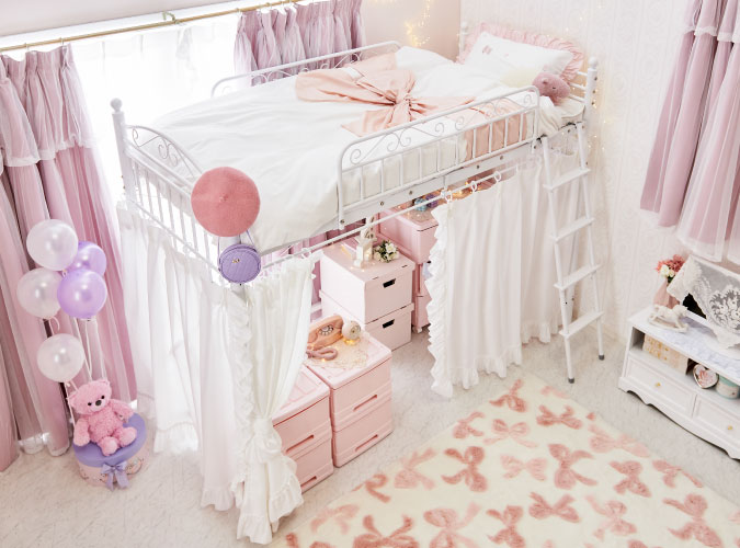 - こちらのようなカーテンレール&リング付きのロフトベットを選べばまるでもう一つの小さなお部屋のよう♪お気に入りのカーテンを取り付けてロフト下にデスクやソファを置けば、秘密基地のように落ち着くスペースに。来客時にサッとカーテンを閉めて目隠しができるもの便利なポイントです。