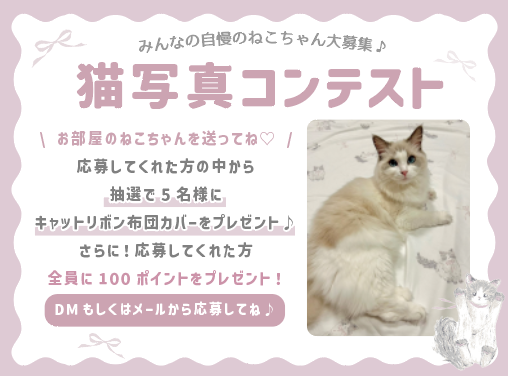 - ロマンティックプリンセスでは、猫写真コンテストを開催いたします! あなたの素敵なお部屋にいるかわいい猫ちゃんの写真を募集します!応募してくれた方の中から抽選で 5名様にキャットリボン布団カバー3点セット(シングル)をプレゼント。さらに応募してくれた方全員に100ポイントをプレゼント!ぜひ応募してね♪