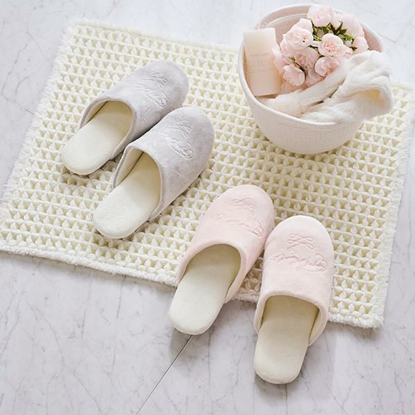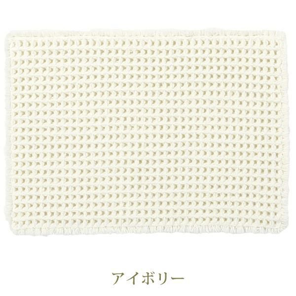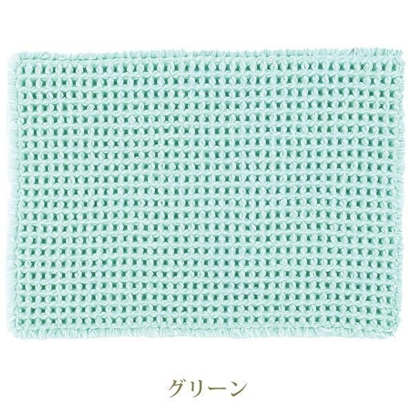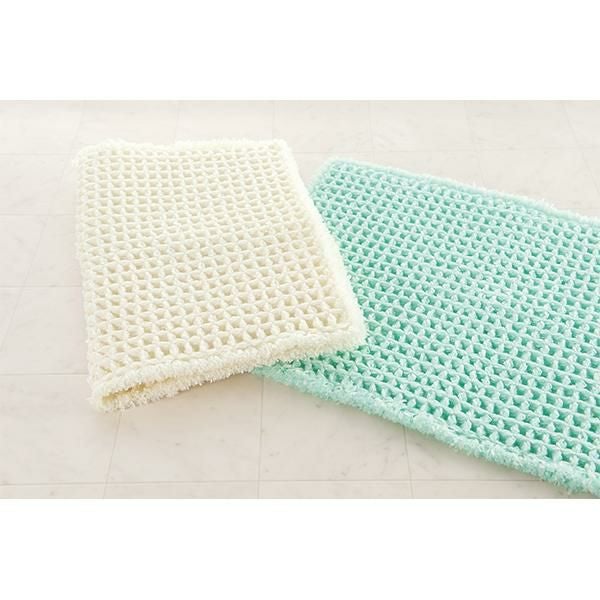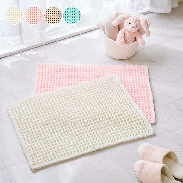 シャリ感のあるスリット糸をワッフル生地に織り込んだ吸水性・速乾性に優れたバスマット。凹凸がふんわり可愛く、弾力のあるフカフカした踏み心地です。裏面にはすべりにくい加工を施しています。