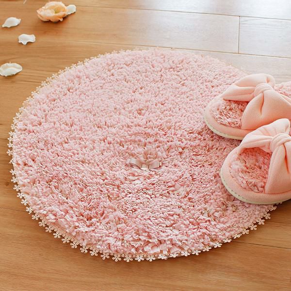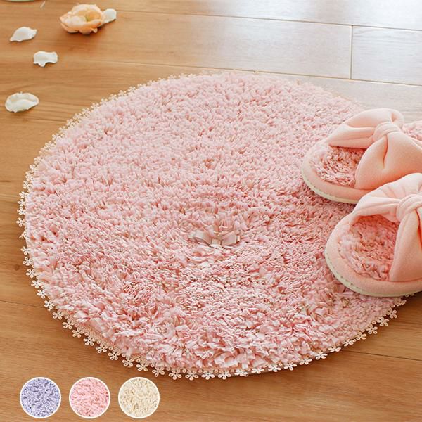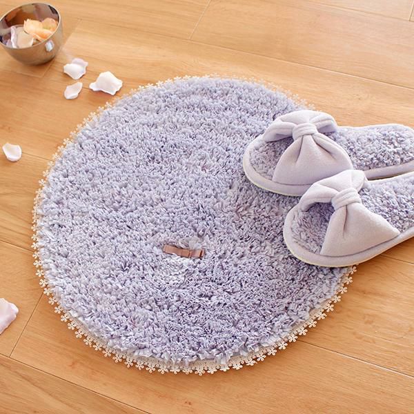 ふわふわの平らになった特殊な糸の中にラメの糸が見え隠れし、光が当たるとキラッと輝きます。淡いカラーと上品なラメ感で優しい印象。それぞれのカラーに合わせた、上品なサテンのリボンと、縁には花のモチーフのレースをあしらいました。バスマットとしてもお使いいただけますが、ソファ前、ベッドサイドやドレッサーの前など、アクセントラグとしてもオススメ。置くだけでパッと華やかになります♪落ち着いたスモーキーパステルカラーを基調とし、ふんわり優しいピンクと、上品で綺麗なパープル、きれいめカジュアルなベージュの3色展開。裏面には安心のすべり止め加工が施されています。