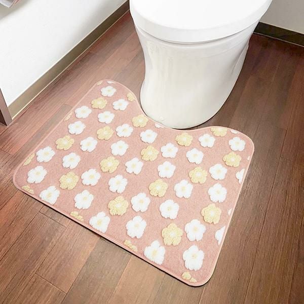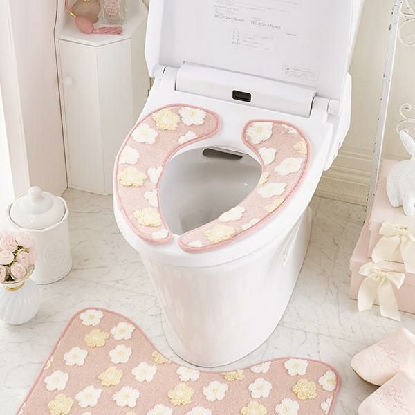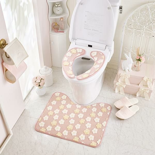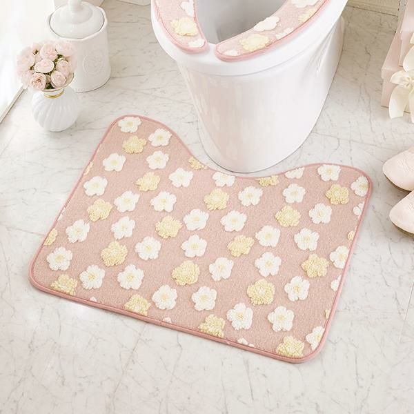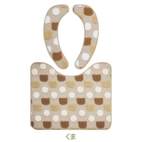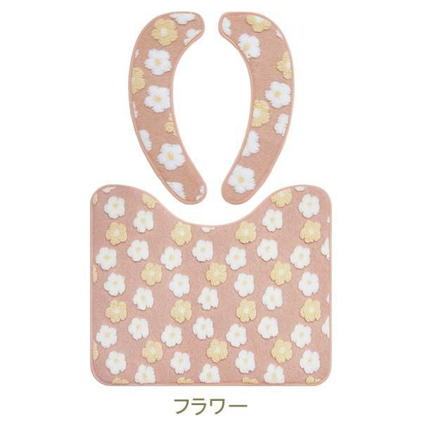 ふんわり柔らかな肌触りの可愛い便座シートとトイレマットの2点セット。もこもこ生地でポコポコと立体的に柄を表現しました。フラワーとくまの優しい温かみのある2柄から選んでいただけます。