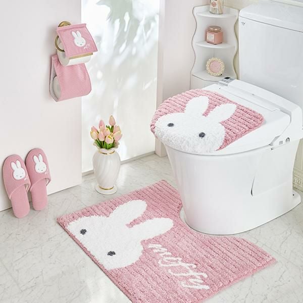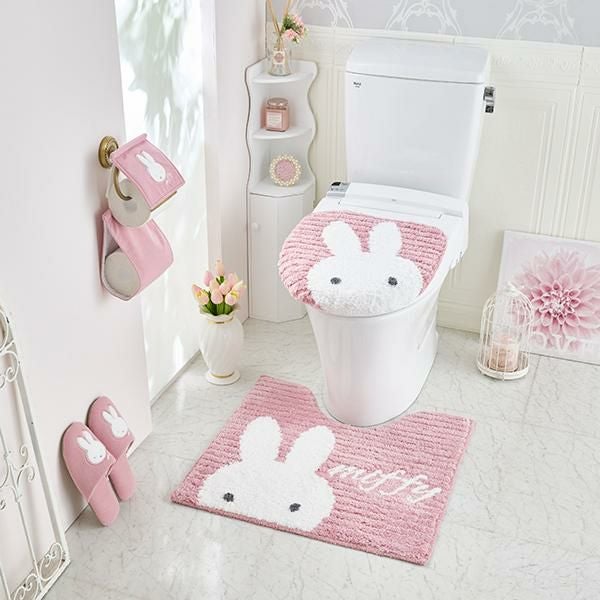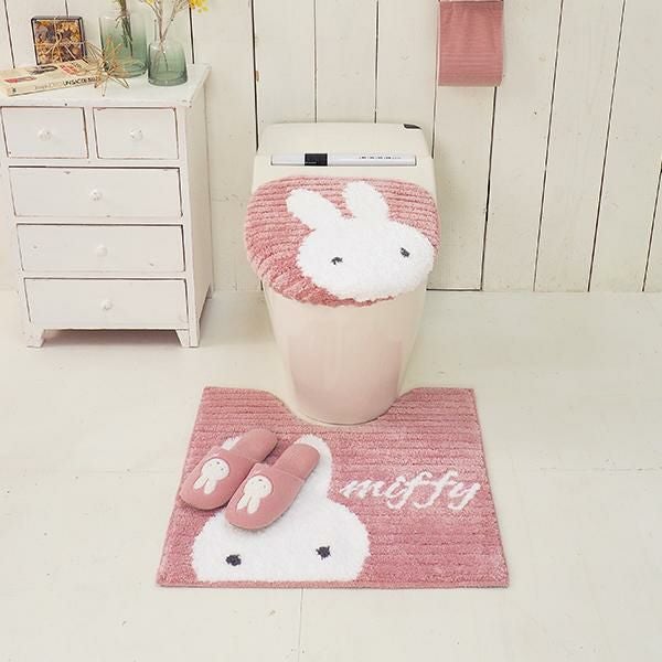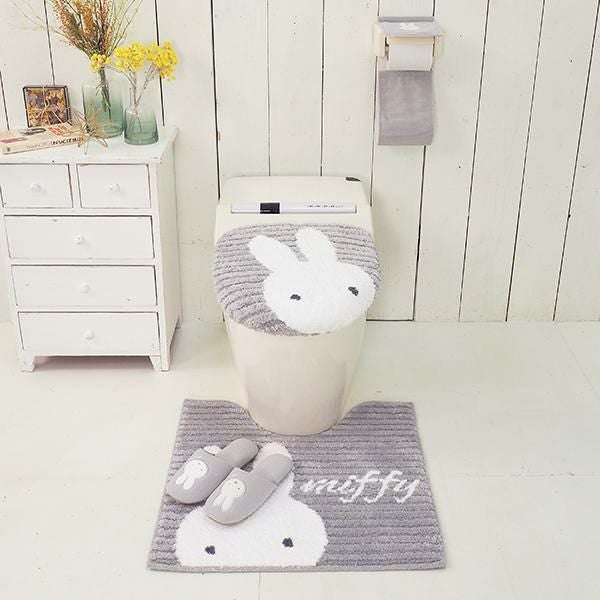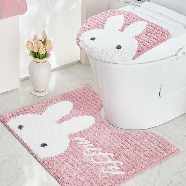 フタカバーとマットは色の濃淡とハイ&ローパイルで表現したシンプルなストライプデザインに、ミッフィーがひょっこり顔を覗かせているデザイン。もちろんフタカバーは普通便座&温水洗浄・暖房便座兼用です。