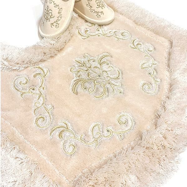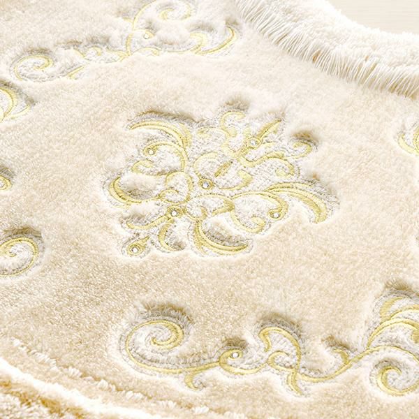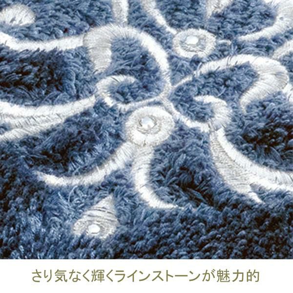 上質に輝く装飾が、王室の高貴な空間へ誘う、優美な宮殿のサロンをイメージしたシリーズ。落ち着きと気品を感じる煌びやかな装飾柄に、さりげなく輝くラインストーンが魅力的なトイレマットです。光沢のある糸を使用し、見る角度によってニュアンスのあるやわらかな表情を見せてくれます。シリーズでのコーディネートでラグジュアリーなトイレ空間作りが叶います。