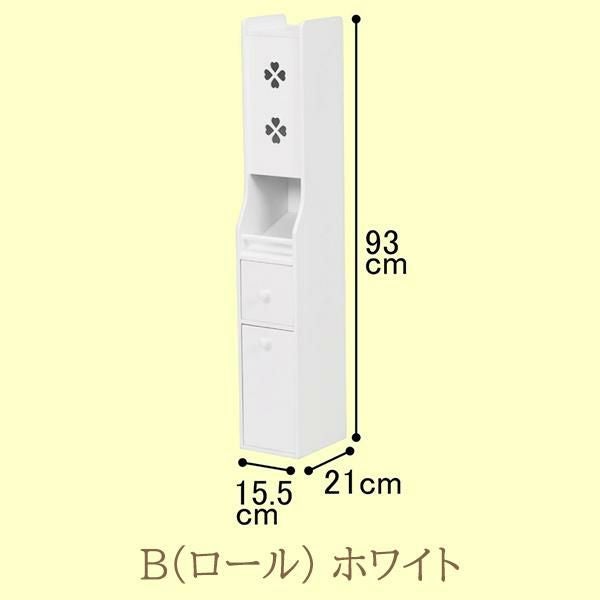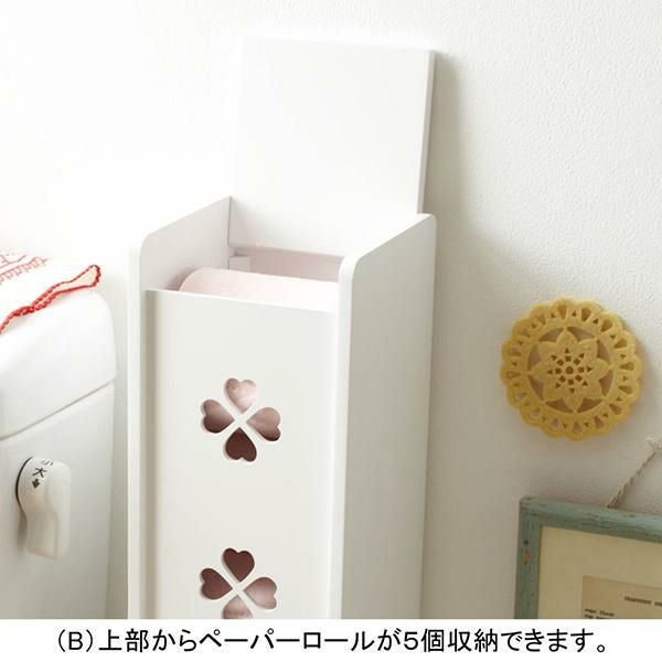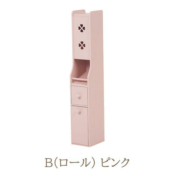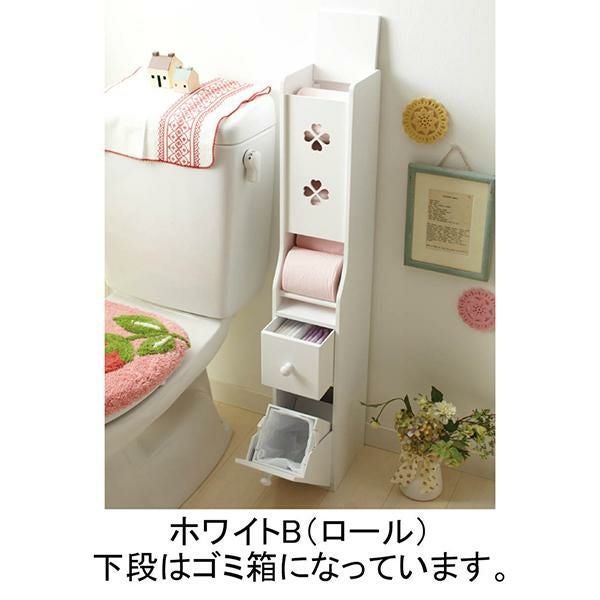 Aは、コーナーのデッドスペースに置けて、お掃除グッズをしっかり収納。オープン棚はディスプレイも楽しめます。Bの正面タイプは、ペーパーロールが5個収納でき、引き出しとゴミ箱がついた1台3役。