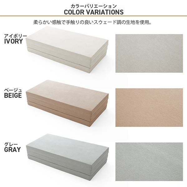 ゆったり寝れる折りたたみマットレス。柔らかい感触で手触りの良いスウェード調の生地を使用しました。使わないときはたためるのでちょっとした隙間に収納でき、自立するので立て掛けて湿気対策もできます。底付きを感じない厚み10cmに、モールドウレタン特有の硬めの寝心地です。