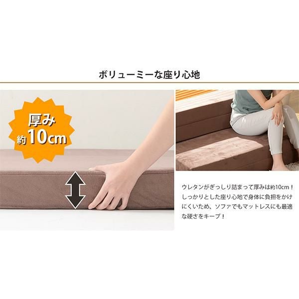 たたみ方を変えるだけで4つのパターンに。ローテーブルにぴったりな「ソファスタイル」、少し広げて背もたれに寄りかかりながらくつろげる「背もたれマットレススタイル」、完全に伸ばした「マットレススタイル」、枕のように1つたたんで「枕付きマットレススタイル」。自分のくつろぎスタイルにあわせてアレンジできます。モールドウレタン特有の硬めな仕上がりで、厚さ10cmとボリュームある設計のため、身体に負担をかけにくい事が特徴。1人暮らしやワンルームの方におすすめなサイズです。