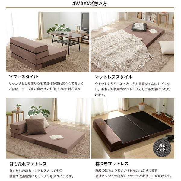 たたみ方を変えるだけで4つのパターンに。ローテーブルにぴったりな「ソファスタイル」、少し広げて背もたれに寄りかかりながらくつろげる「背もたれマットレススタイル」、完全に伸ばした「マットレススタイル」、枕のように1つたたんで「枕付きマットレススタイル」。自分のくつろぎスタイルにあわせてアレンジできます。モールドウレタン特有の硬めな仕上がりで、厚さ10cmとボリュームある設計のため、身体に負担をかけにくい事が特徴です。
