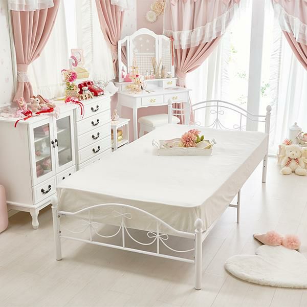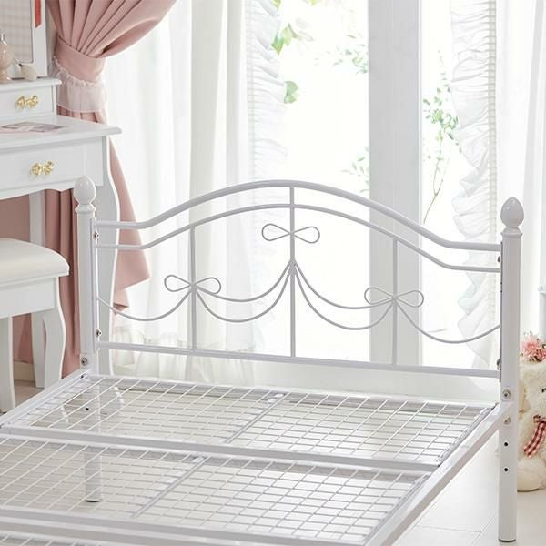 白色のフレームにリボンモチーフのかわいいフォルムがプリンセス気分のアイアンベッド♪