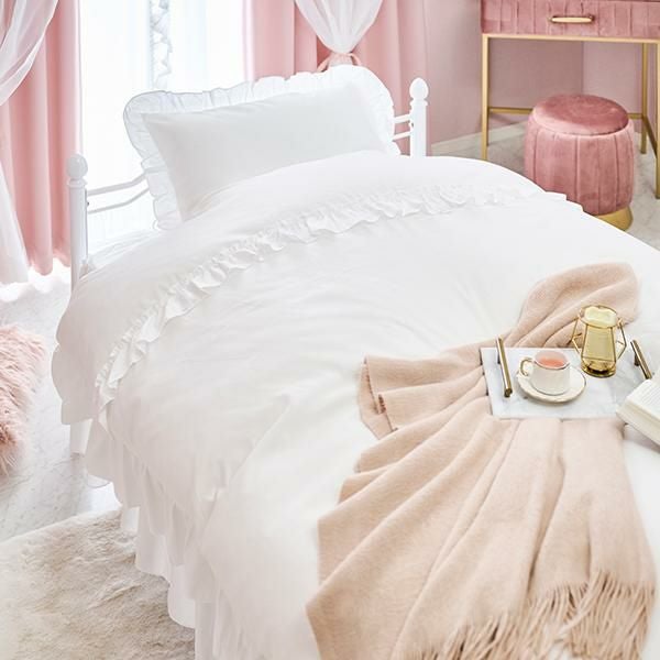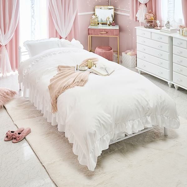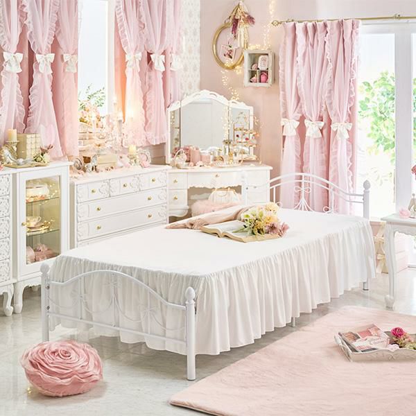 フリル付きの布団カバーやベッドスカートを可愛く見せられるように、細部にまでこだわった低めのフットボードのデザイン。