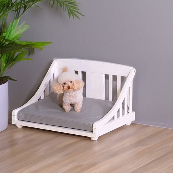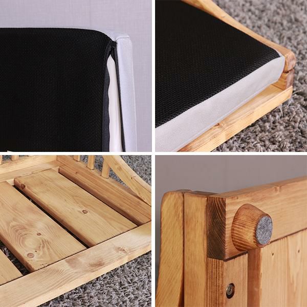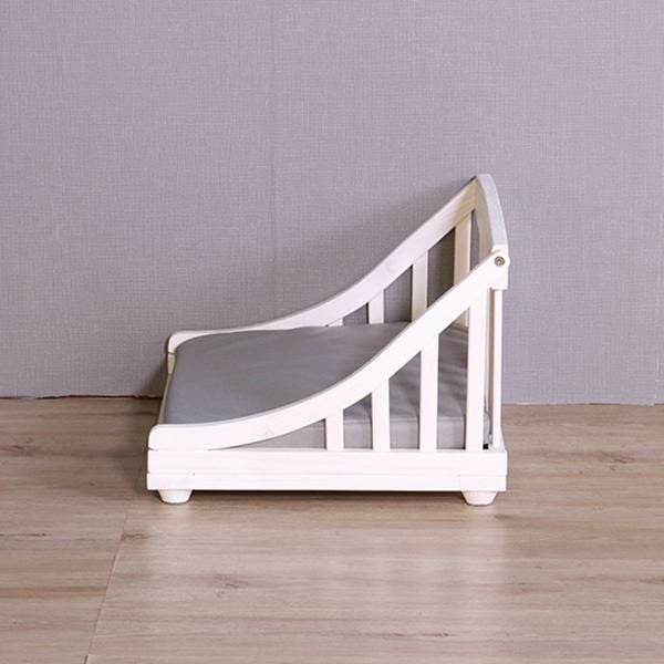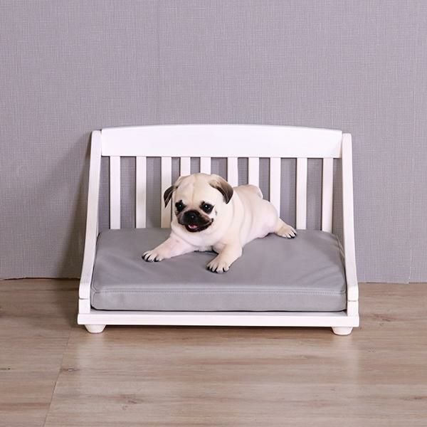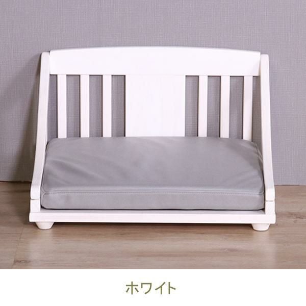 北欧パイン材に、安全・安心な天然オイルを使用。可愛いホワイト色とブラウン色の2色展開をご用意しました。底は通気性の良いすのこ仕様で、クッションは傷に強いレザーファブリック(ポリエステル100%)生地を使用しています。またクッションはカバーリングになっているので、お手入れも簡単。マット高が9cmで小型犬なども乗り降りが楽!床に傷がつかないように足裏用フェルト付きでボルトだけの簡単組立てです。(組立用レンチ付)