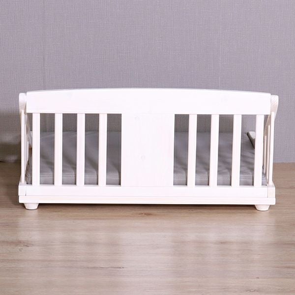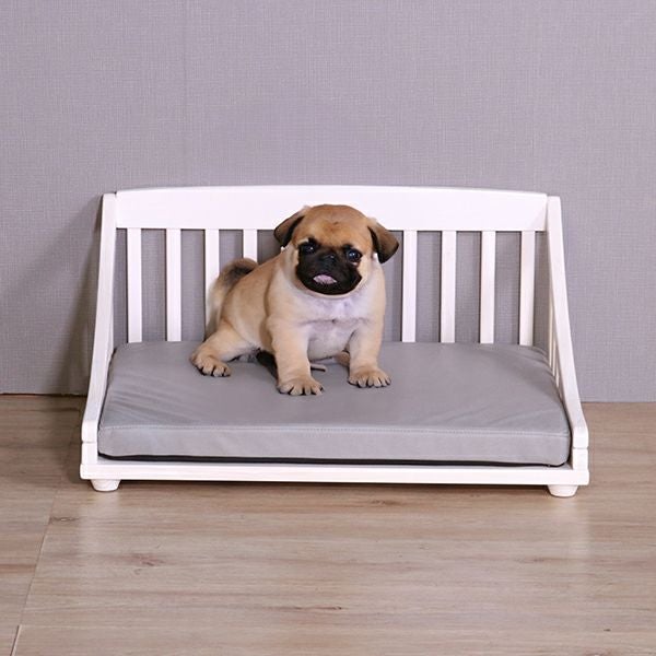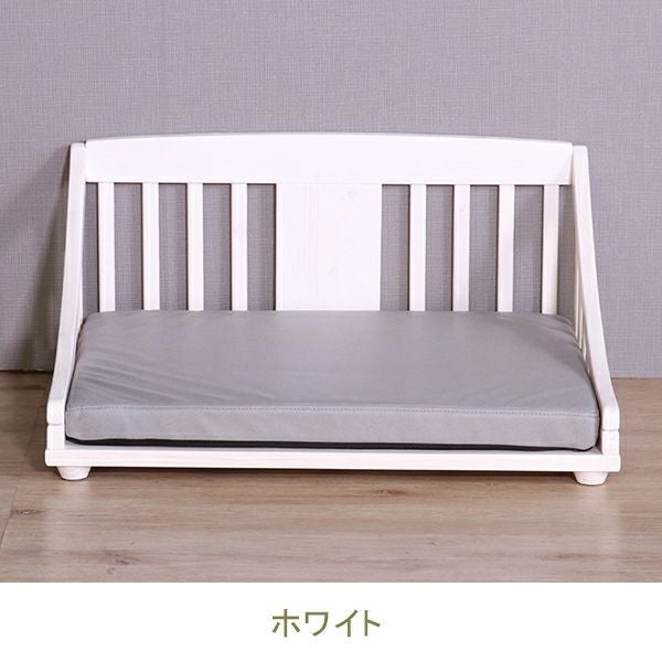 北欧パイン材に、安全・安心な天然オイルを使用。可愛いホワイト色とブラウン色の2色展開をご用意しました。底は通気性の良いすのこ仕様で、クッションは傷に強いレザーファブリック(ポリエステル100%)生地を使用しています。またクッションはカバーリングになっているので、お手入れも簡単。マット高が9cmで小型犬なども乗り降りが楽!床に傷がつかないように足裏用フェルト付きでボルトだけの簡単組立てです。(組立用レンチ付)