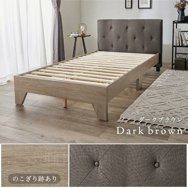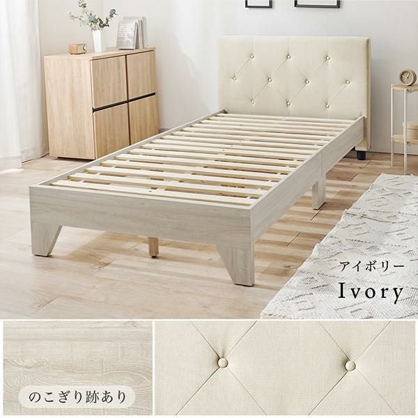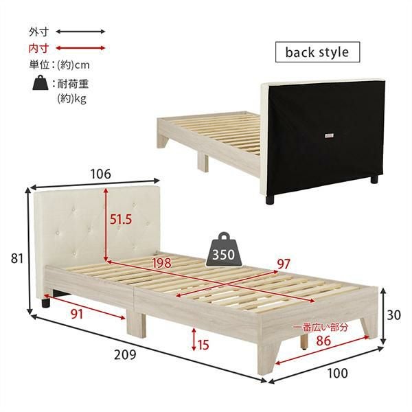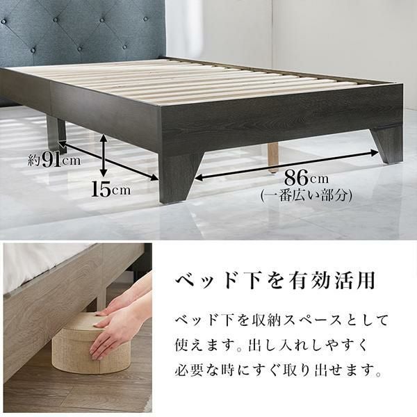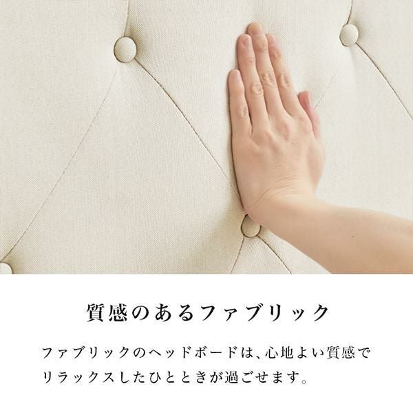 ひし形のステッチが落ち着いたムードのベッドボードが上品なシングルベッド。ヘッドボードは約10cmの厚みがあり、クッション性もあるしっかりとした背もたれで寄りかかっても大丈夫。心地よい質感のファブリックでリラックスしたムードを演出します。床面高が約30cmで寝起きがしやすく安定感のある丁度良い設計。ロータイプなので圧迫感が少なくお部屋を広く見せてくれます。またベッド下が約15cmあるので収納スペースに有効活用できます。床面はすのこ仕様で通気性が良く、湿気がこもりにくいのが特徴。オールシーズン快適に使えます。