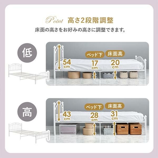 すっきりとしたシルエットに、丸みのあるヘッド&フットデザインがほんのり可憐なアクセント。シンプルなデザインながら、お部屋をやさしく彩るフェミニンな佇まいのベッドです。床面の高さは2段階で調整可能。31cmに設定すれば、ベッド下を収納スペースとして活用でき、20cmにすればお部屋を広く見せながらヘッドデザインを美しく引き立てます。通気性に優れたメッシュ床板と、しっかり身体を支えるボンネルコイルマットレス付きで、快適な寝心地にもこだわりました。