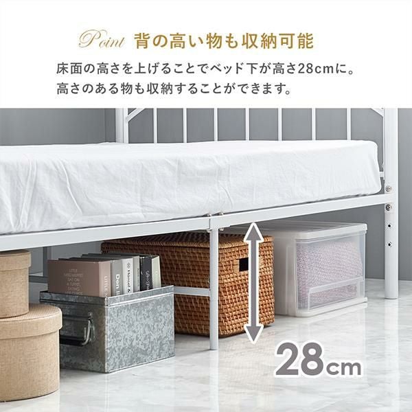 すっきりとしたシルエットに、丸みのあるヘッド&フットデザインがほんのり可憐なアクセント。シンプルなデザインながら、お部屋をやさしく彩るフェミニンな佇まいのベッドです。床面の高さは2段階で調整可能。31cmに設定すれば、ベッド下を収納スペースとして活用でき、20cmにすればお部屋を広く見せながらヘッドデザインを美しく引き立てます。通気性に優れたメッシュ床板と、体型に沿うように点で支え、体圧を分散するポケットコイルマットレス付きで、快適な寝心地にもこだわりました。
