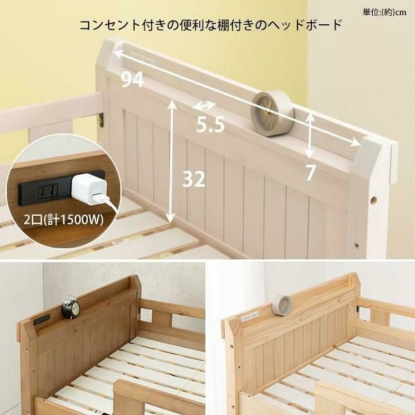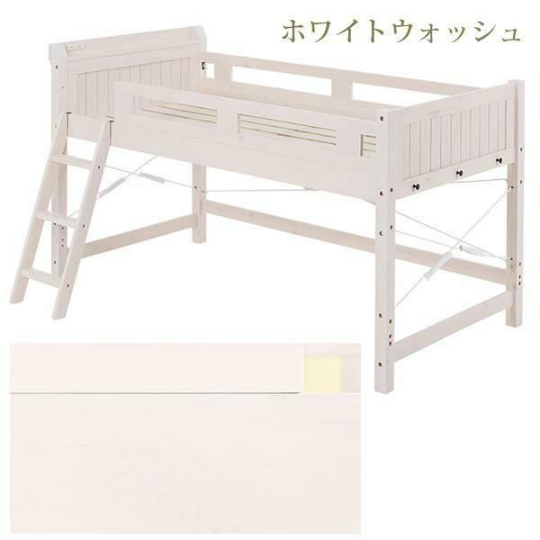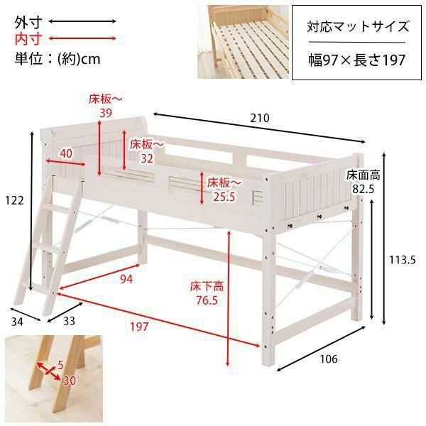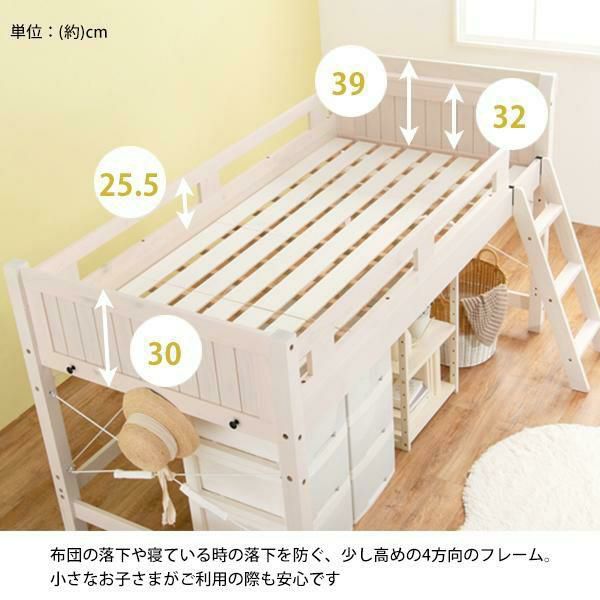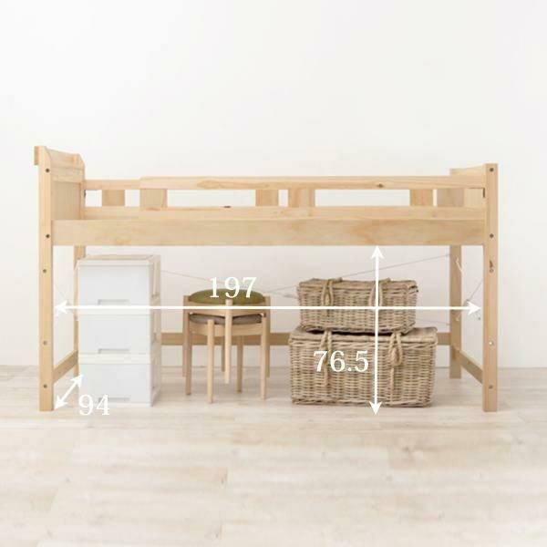 省スペースでつくる自分だけの空間。強度と耐久性に優れたロフトベッド。ベッド下76.5cmと大容量収納スペース。大きめの収納ケースも15個収まるので置き場所に困るものはベッド下に。家で使用している敷布団がそのまま使えるので、新しくマットレスを購入する必要はありません。2口コンセント付きの宮棚には目覚まし時計も置けます。また小物を引っ掛けるときに便利なサイドフック付き。