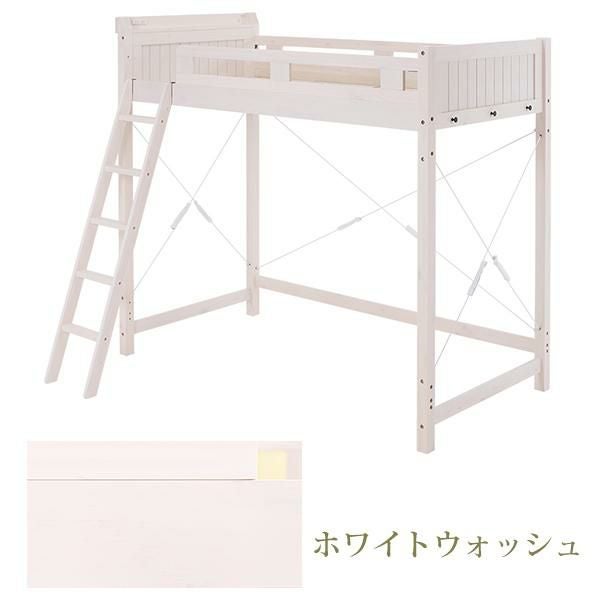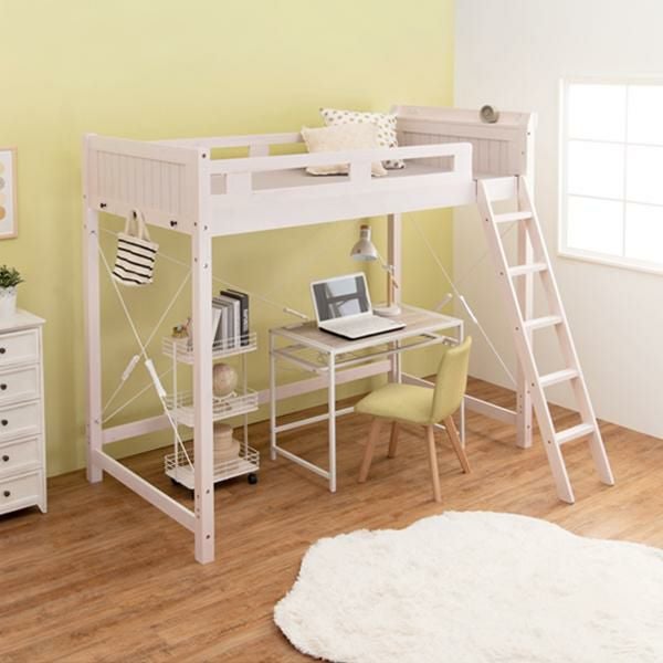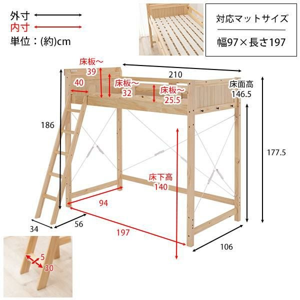 省スペースでつくる自分だけの空間。強度と耐久性に優れたロフトベッド。ベッド下140cmと大容量収納スペース。大きめの収納ケースも25個収まるので置き場所に困るものはベッド下に。家で使用している敷布団がそのまま使えるので、新しくマットレスを購入する必要はありません。2口コンセント付きの宮棚には目覚まし時計も置けます。また小物を引っ掛けるときに便利なサイドフック付き。