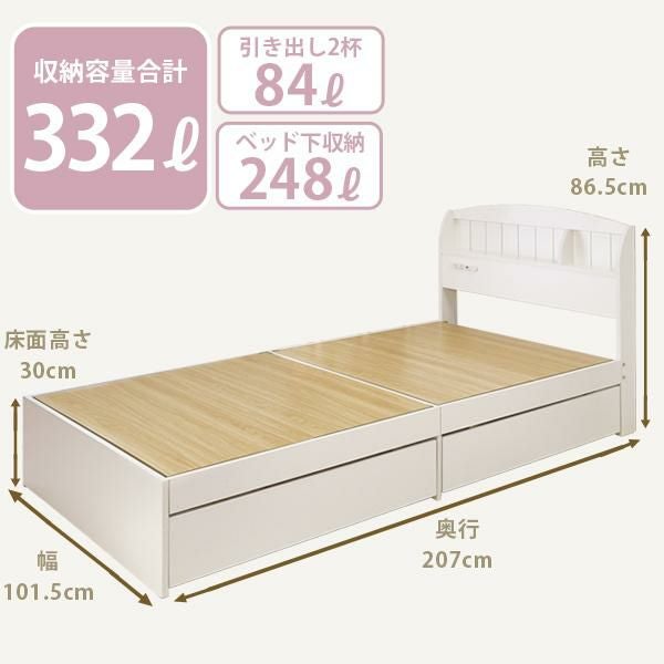 ベッド下に2杯の引き出しと空間があるので、たっぷり収納ができるベッド。