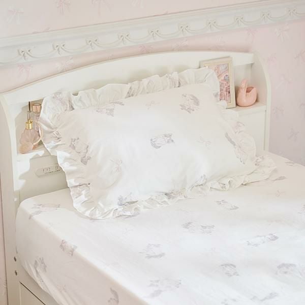 愛らしい7匹のネコたちがかわいい布団カバーセットは、ピュアホワイトのグランドに、ピンクのリボンを合わせ、淡いグレーとピンクで甘く優しいムードにデザインしました。掛けカバーの衿元とピローケースの周囲にはたっぷりとしたフリル。ベッドシーツはボックスタイプなのでベッドの高さを選ばずにご使用いただけます。裏面はめくったときも可愛い、無地の淡いピンクカラーです。