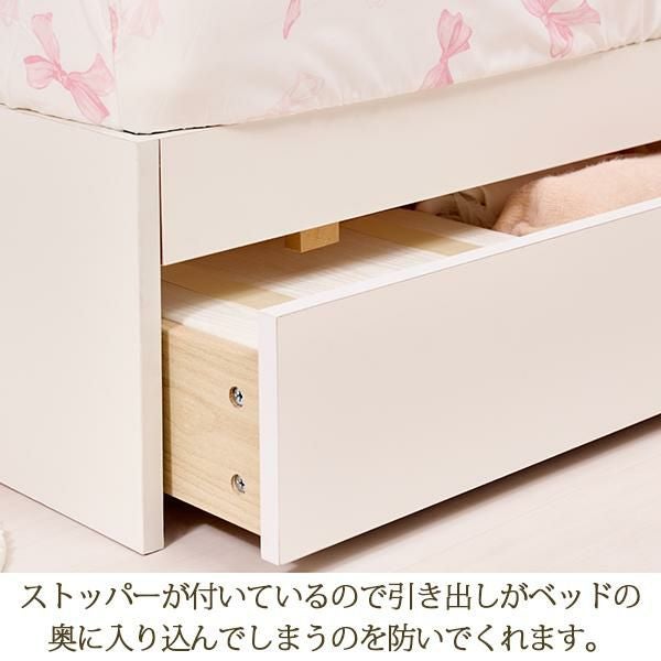 かわいいのに、頼れる収納力!ベッド下に2杯の引き出しと空間があるので、たっぷり収納ができるベッド。ナチュラルで可愛らしい雰囲気のヘッドボードは、宮棚付きなのでスマホやディフューザー、目覚まし時計などちょっとした小物も可愛くディスプレイできます。コンセント2口にUSBポートまで付いているので、ベッド回りでゆったり過ごせそう♪引き出しはキャスター付きで出し入れもスムーズ。お部屋のレイアウトに合わせて、左右どちらにも取り付けることができます。引き出し奥の空スペースにはラグや毛布などシーズンオフのアイテムやスーツケースなど、クローゼットだと場所をとるものの収納にピッタリ。収納場所が足りないお部屋でもスッキリ片づけられるので、かわいいお部屋作りが叶います!