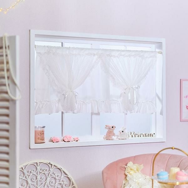 小窓や、棚上、ラックなど・・・ちょっと隠したい場所を可愛くアレンジ。幅の狭い場所でもギャザーが可愛く、リボンがアクセントになるようにサイズと配置にこだわりました。