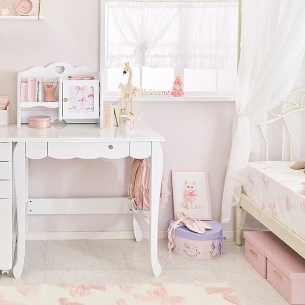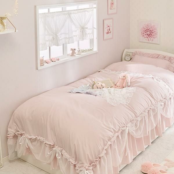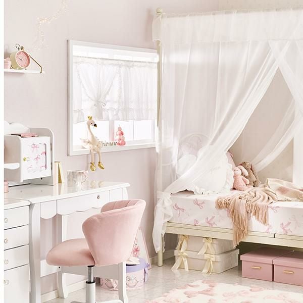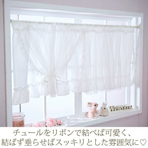 ホワイト生地の裾にはたっぷりのフリルをあしらい、その上にドットチュールのレースを重ねダブルカーテン風のデザインに。ドットチュールを付属のリボンで留めれば、違った雰囲気を楽しめます。