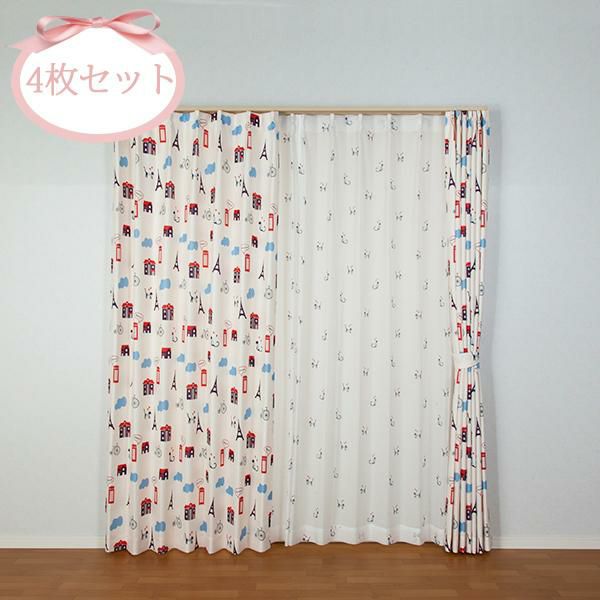 ネコ×パリのお散歩イメージがオシャレな、レースカーテン付き4枚セット♪