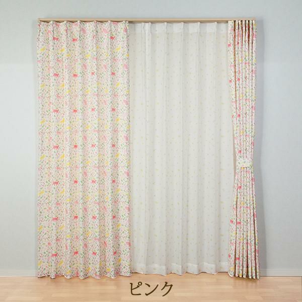 お花畑をお散歩するネコちゃんがかわいい、レースカーテン付き4枚セット♪