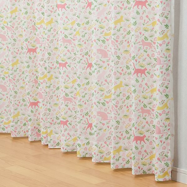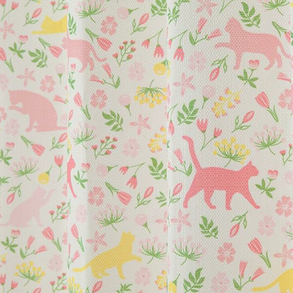 花柄やリーフ柄の中を優雅に散歩する猫たちのシルエットがデザインされたセットカーテン。