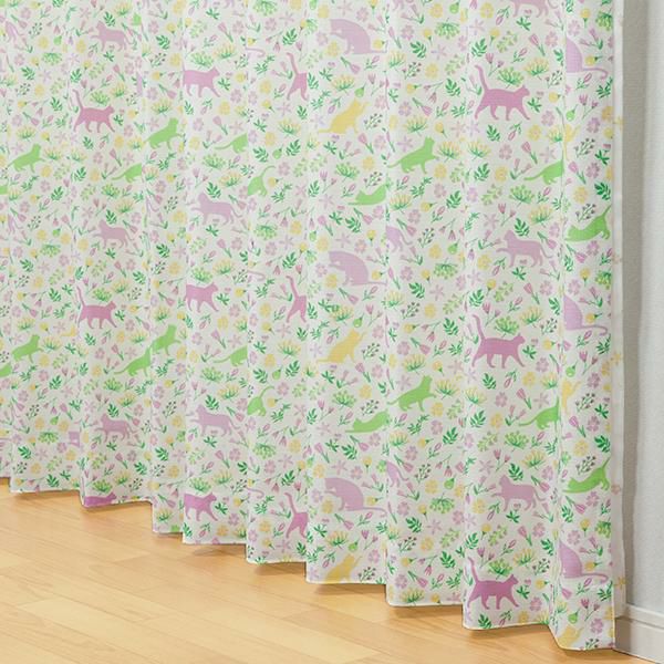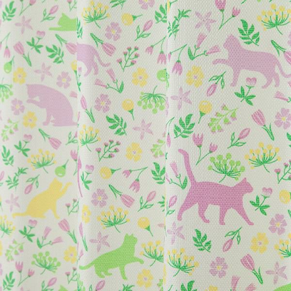 花柄やリーフ柄の中を優雅に散歩する猫たちのシルエットがデザインされたセットカーテン。