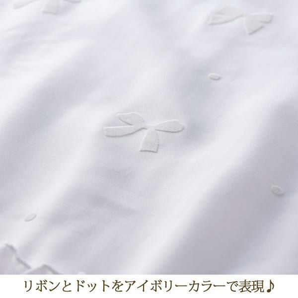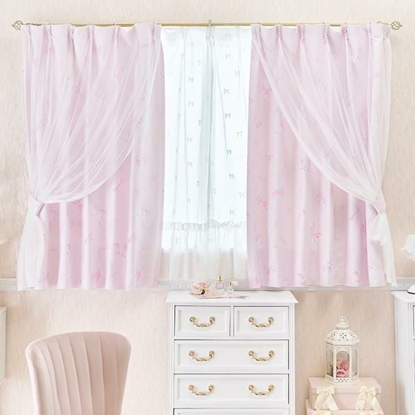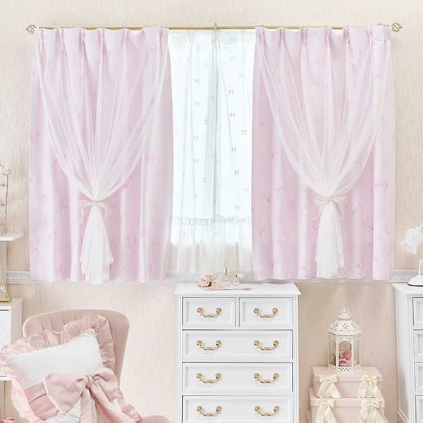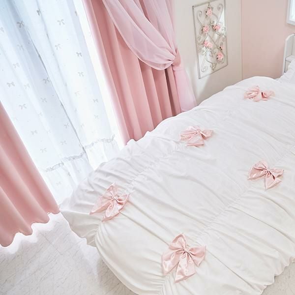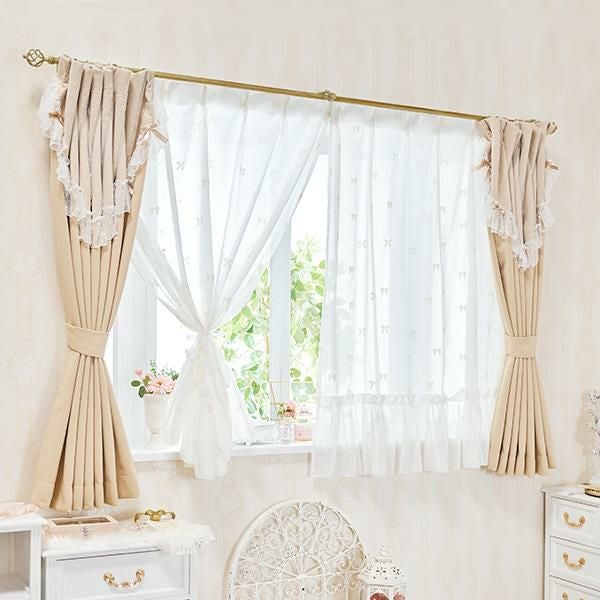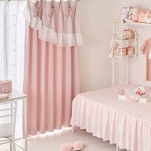 リボンとドットのモチーフをあしらった裾フリルのレースカーテン。