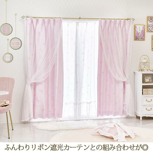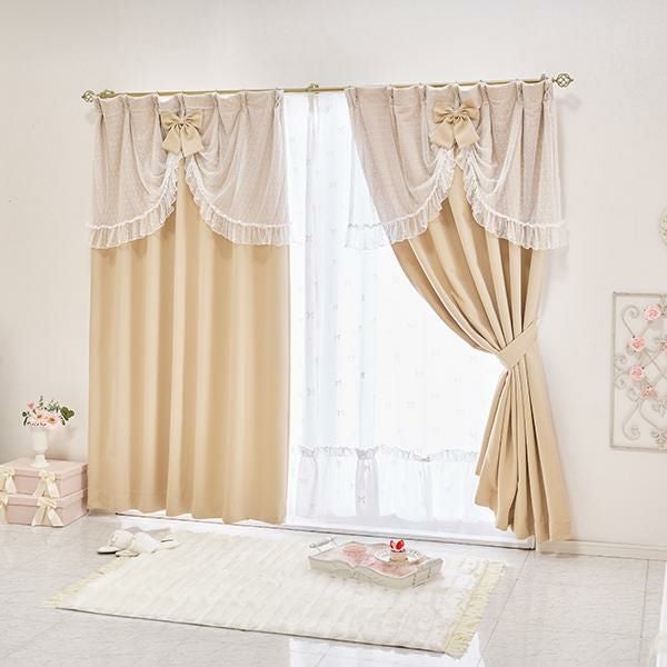リボンとドットのモチーフをあしらった裾フリルのレースカーテン。