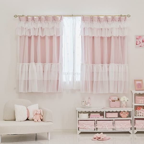 まるでお城のプライベートルームに迷い込んだかのような、宮廷ドレスを思わせるリュクスなデザイン。甘くなりすぎない落ち着いたピンクのドレープに、柔らかなホワイトのボイル生地を重ねることで、奥行きのあるフェミニンな表情を生み出しています。上部には貴婦人のドレスの襟元を思わせるボリュームフリルを、裾には贅沢に段を重ねたティアードフリルを施し、光が差し込むたびに窓辺をやさしくドラマティックに彩ります。