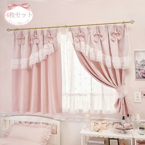 3段フリルの上飾りが目を引く遮光ドレープと、可憐なレースカーテンの4枚セット。ドレープは落ち着いたピンクに白のボイルを重ね、甘くガーリーなデザイン。上部の大きなリボンは取り外し可能で、付属のサテンリボンに付け替えればより繊細な雰囲気へとアレンジできます。セットのレースは、リボンとドットのフロッキー加工を施した立体感のある仕上がり。シワになりにくいボイル生地を使用しており、たっぷりの裾フリルが窓辺を優雅に演出します。細部までこだわったフリルタッセル付きで、お部屋をロマンティックに彩ります。遮光カーテンと、ボイルレースカーテンがセットなっているので、届いてすぐに使えて簡単に可愛いお部屋作りが叶います♪
