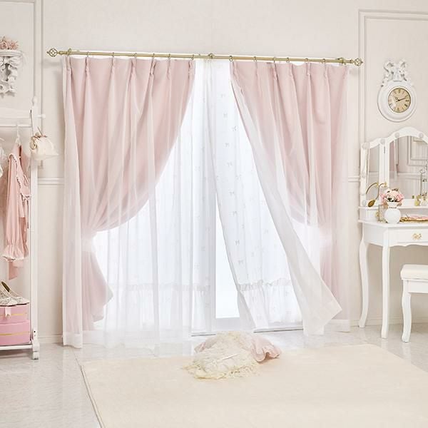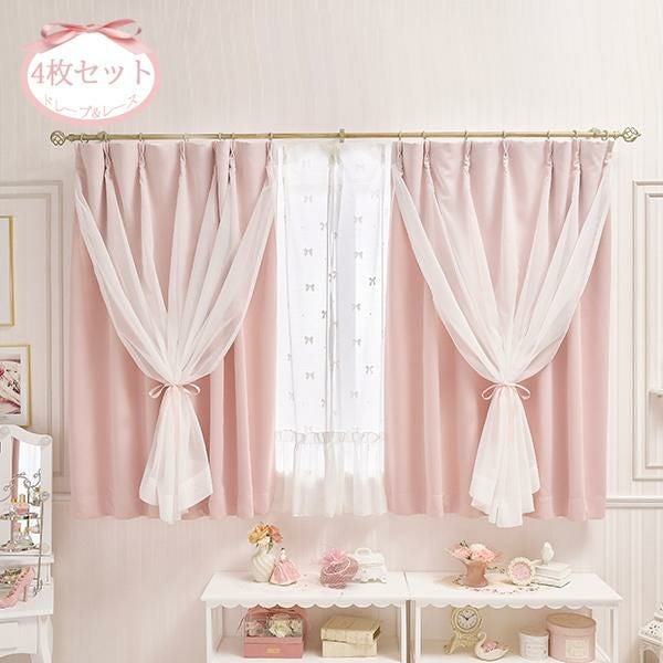 柔らかなピンクカラーにレイヤードしたホワイトが儚げで美しいダブルカーテンのレースカーテン付き4枚セット♪