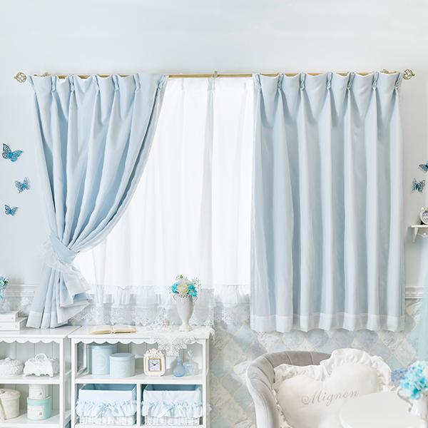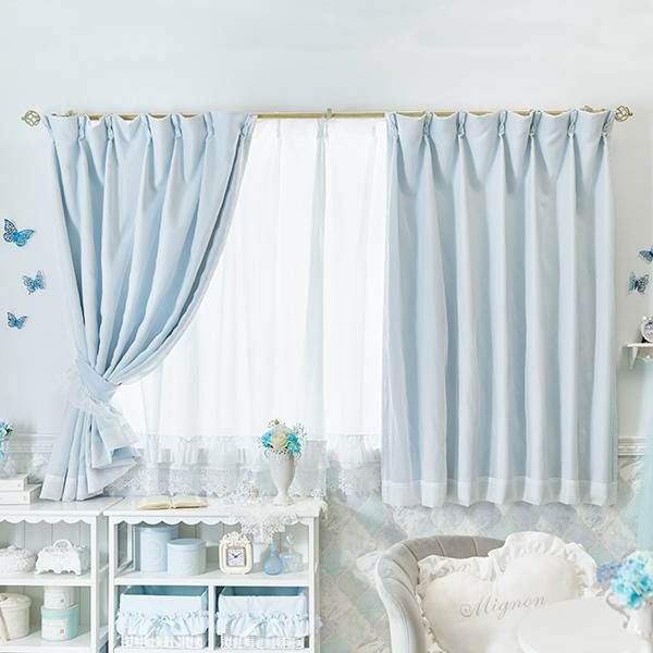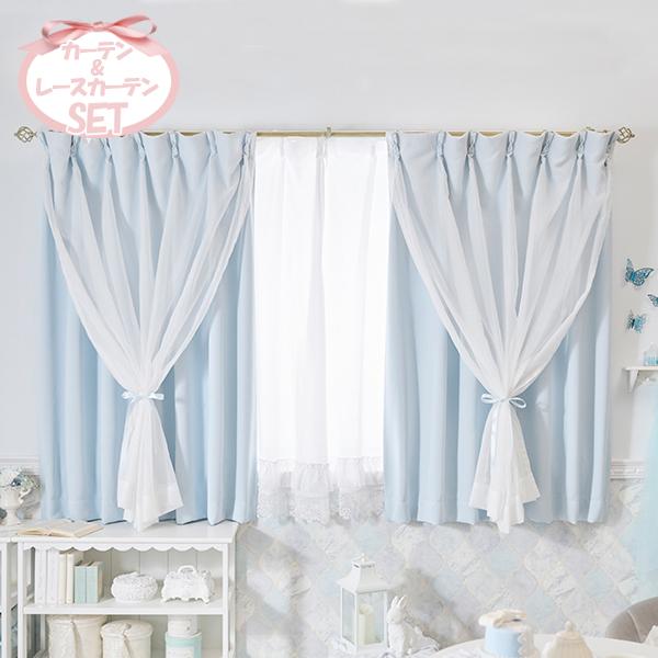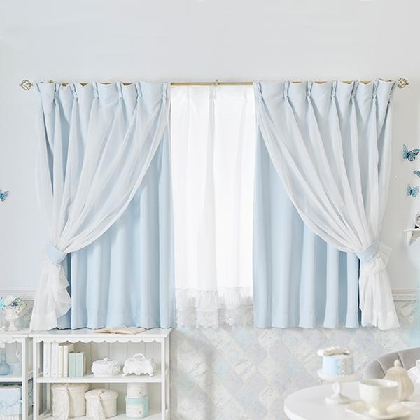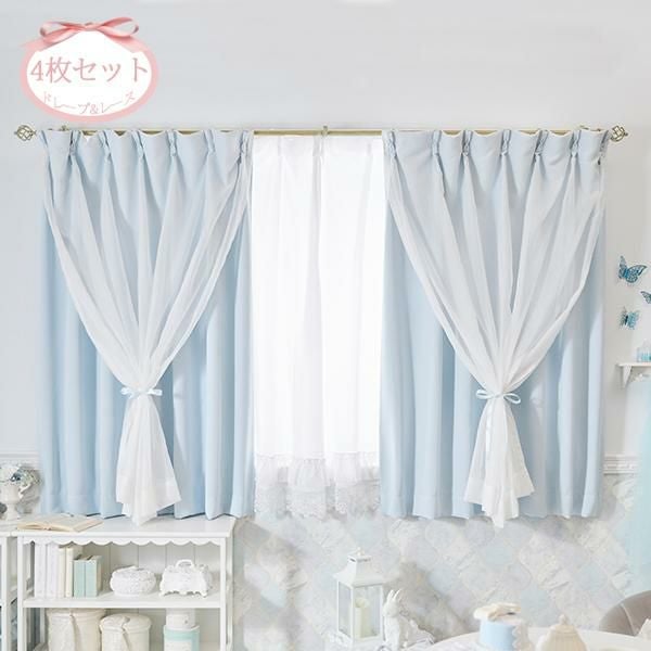 柔らかな水色カラーにレイヤードしたホワイトが儚げで美しいダブルカーテンのレースカーテン付き4枚セット♪