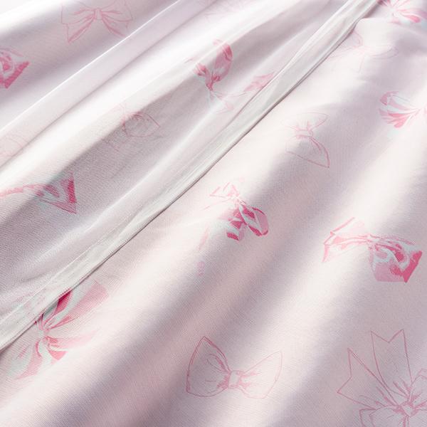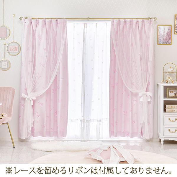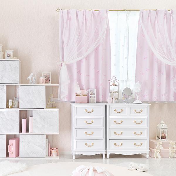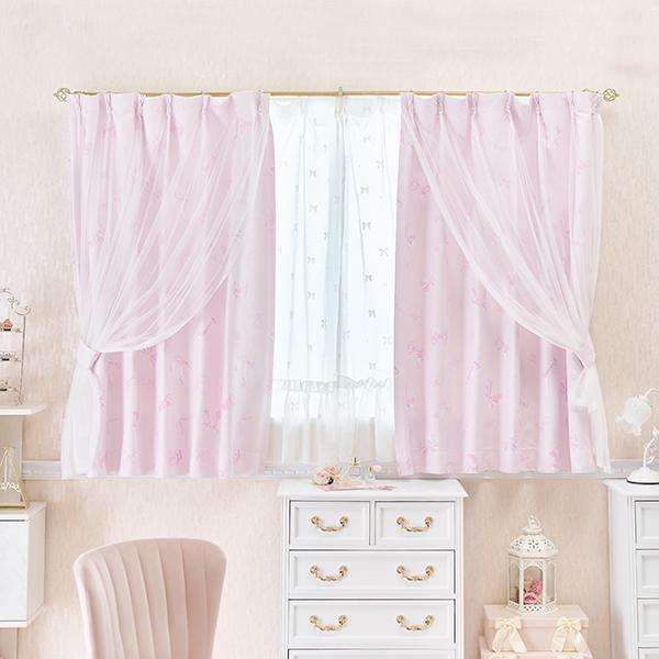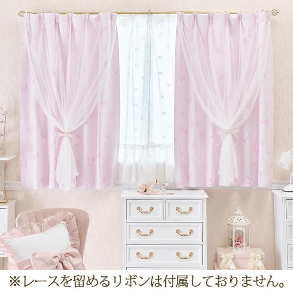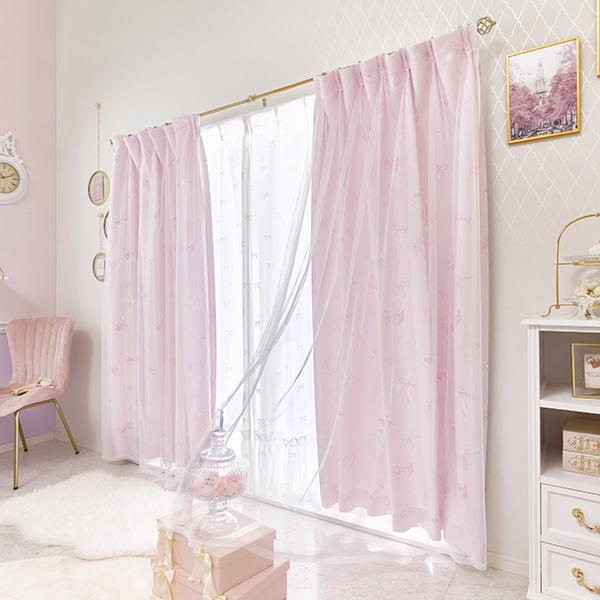 リボンのモチーフをランダムにデザインしたプリントの遮光カーテンと可憐なレースカーテンの4枚セット。ドレープはスイートなピンクカラーでリボンをたっぷりと描きました。立体的で陰影のあるリボンと、線描きのリボンをミックスして繊細な印象に。さらに上からチュールレースをレイヤードして上品さをプラスし、様々なアレンジを楽しめるように。チュールの透け感がリボンのモチーフをふんわりと見せる、柔らかく優しい雰囲気に仕上げました。セットのレースは、リボンとドットのフロッキー加工を施した立体感のある仕上がり。シワになりにくいボイル生地を使用しており、たっぷりの裾フリルが窓辺を優雅に演出します。遮光カーテンと、ボイルレースカーテンがセットなっているので、届いてすぐに使えて簡単に可愛いお部屋作りが叶います♪