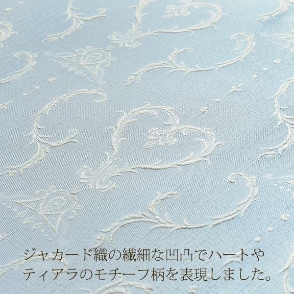 プリントとは違う織で表現された柄の陰影が美しく高級感のある手法で、オーナメント調の柄にティアラやハートのモチーフをあしらいました。