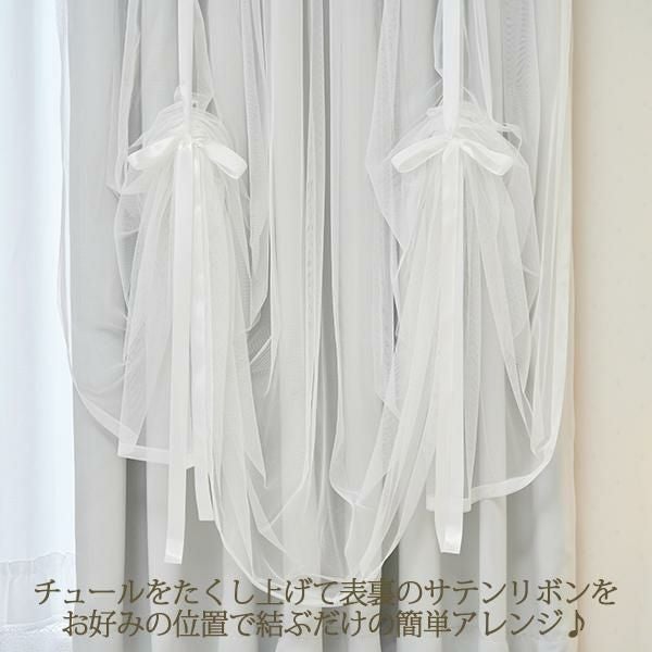 ふんわり上品さのある淡いグレーカラーに合わせた真っ白なサテンテープリボン。絶妙な透け感のチュールとリボンで自分オリジナルのアレンジレイヤードカーテンが作れます。