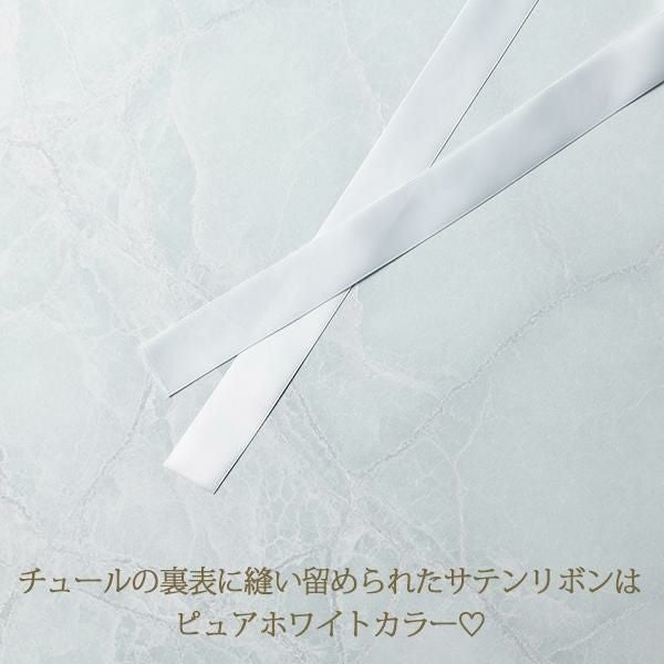 チュール生地の表裏2か所にサテンリボンが縫い留められているので、リボンの結び方で様々な形にアレンジ自由。表裏のリボンをそれぞれ縦に結んでスカラップ状の上飾りを作ったり、左右のリボンを結んで大きな半円を作ったり、中央でチュールとリボンをまとめてリボン結びにすればインレースのようにできます。エレガントでラグジュアリーなムードからロマンティックフェミニンなムードまで、アレンジで変化を楽しんでいただけます。