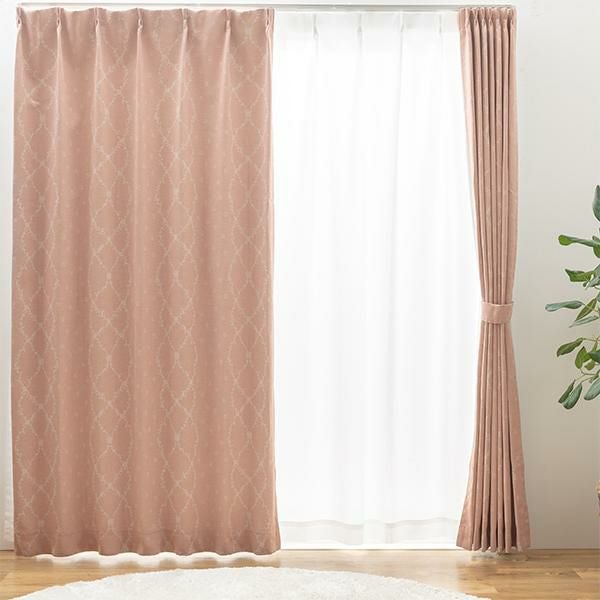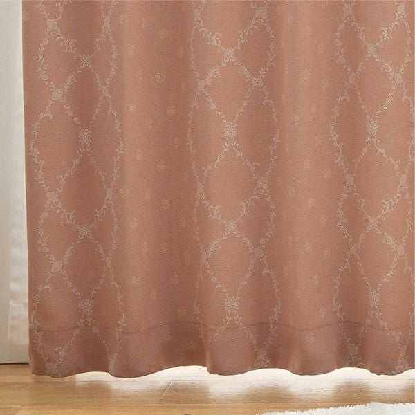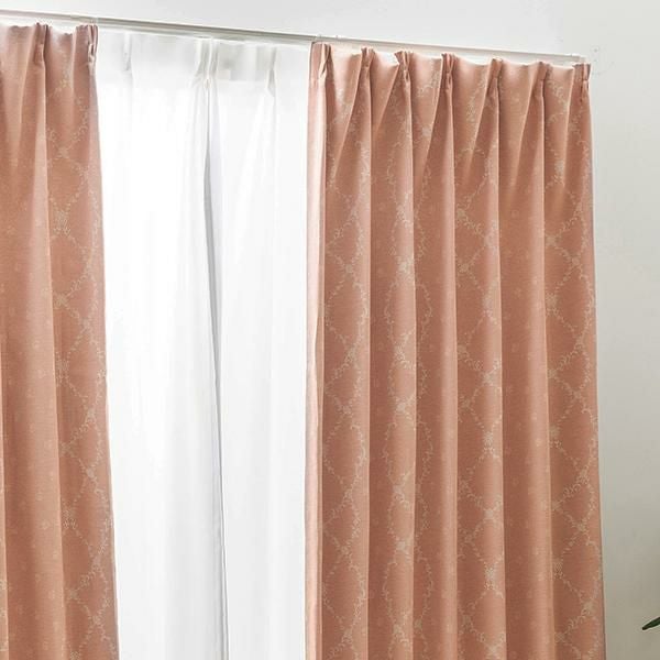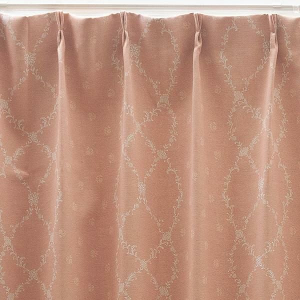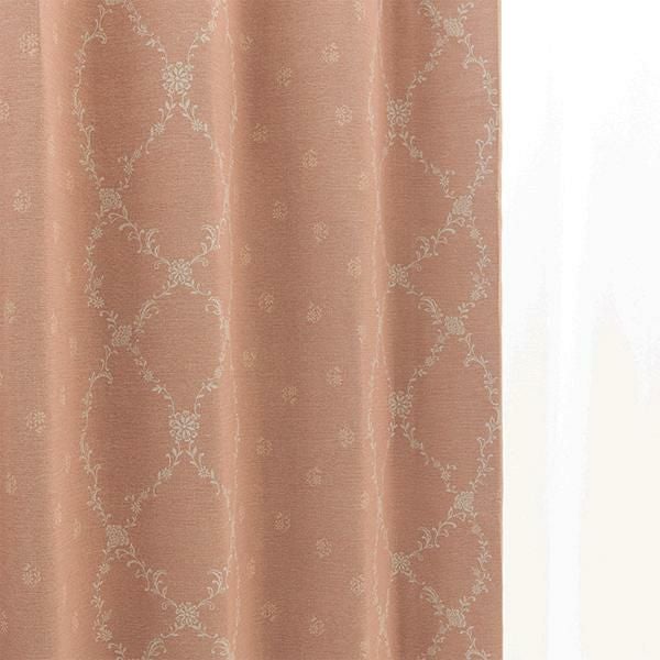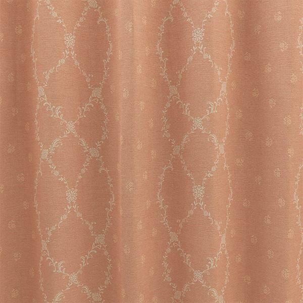 一見シンプルなサーモンピンクのカーテンは織柄に見えるようなプリントを施され、その上に波柄のように小花や唐草で構成したこだわりあるデザイン。