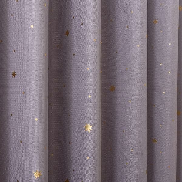 上品なパープルカラーに星やドットモチーフを箔プリントしたきらきらデザインが可愛いセットカーテン。