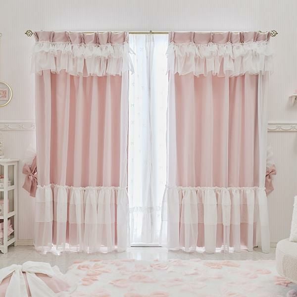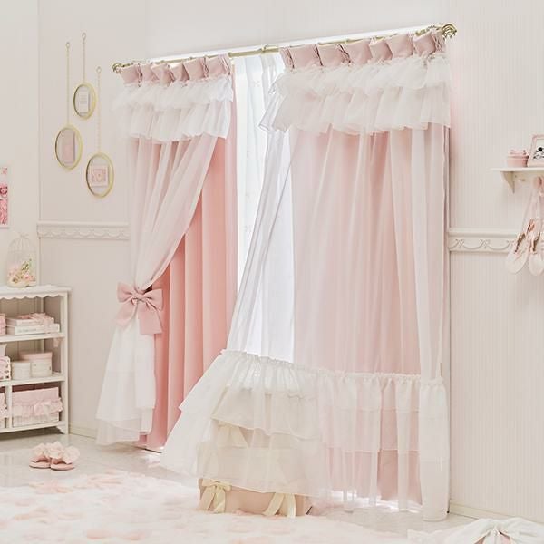 幾重にも重なるフリルとリボンが優雅に視線を集める、憧れのドレスのような遮光カーテン。窓辺に、気品あふれるお城のような彩りを♪