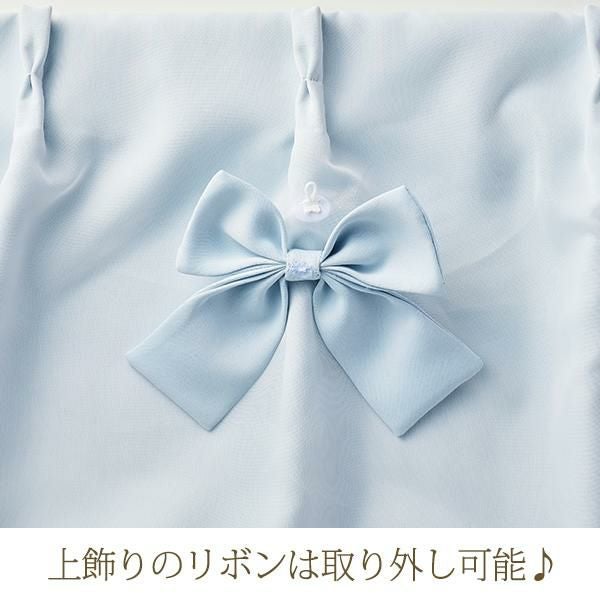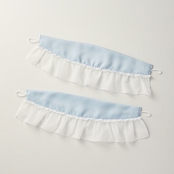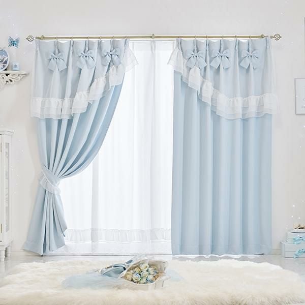 曲線を描くように斜めに縫い留められた上飾りの裾は、ギャザーたっぷりの3段フリルに仕上げました。上部には大きなリボンを片側3つずつあしらいアクセントに。大きなリボンは取り外し式で、サテンリボンに付け替えれば優しく儚げな雰囲気にもアレンジできます。優しく淡い水色のドレープに柔らかなホワイトのボイル生地を重ねガーリーなイメージに。タッセルにもホワイトのフリルを付け、特別感のあるデザインに仕上げました。光を遮りながら、窓辺を彩る遮光カーテン。ロマンティックガーリーなお部屋の演出にピッタリのアイテムです。