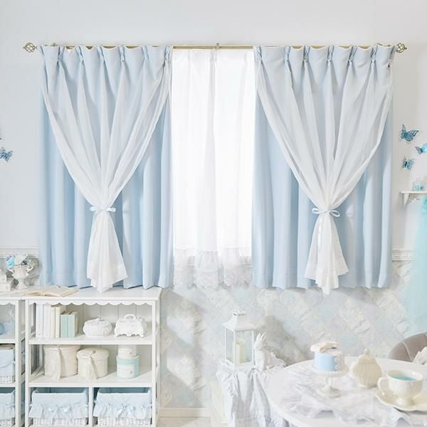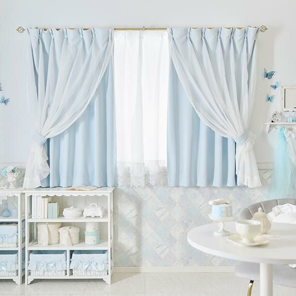 優しく淡い水色のカラーにレイヤードしたホワイトが儚げで美しい、3WAYのダブルカーテン♪
