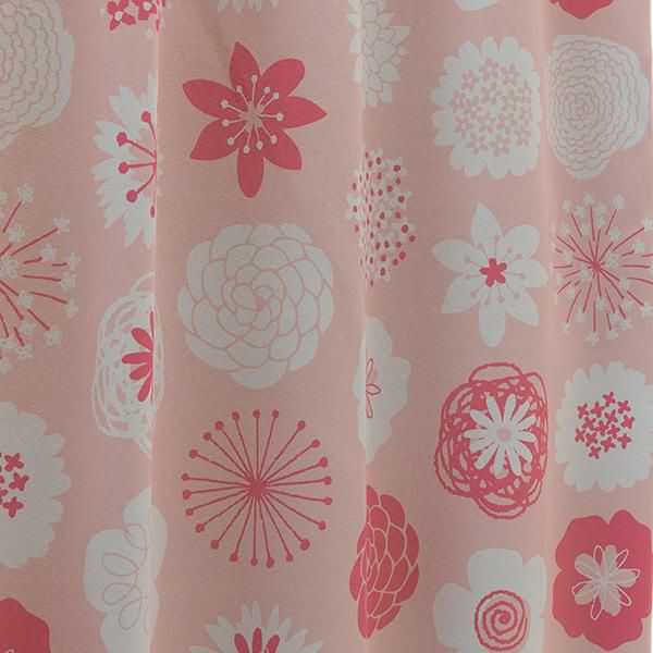 様々な形の花柄やモチーフ柄がランダムにデザインされた4点セットのカーテン。