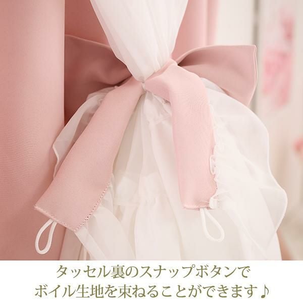 タッセルにあしらわれた特別感のある大きなリボンがアクセント♪タッセル自体にもホワイトのフリルを添えたこだわりのデザインで、手前のボイル生地をふんわりと束ねれば、より一層ドレスに近い美しいドレープシルエットへと変化。その日の気分に合わせたアレンジで、窓辺に華やかなアクセントを添えてくれます。