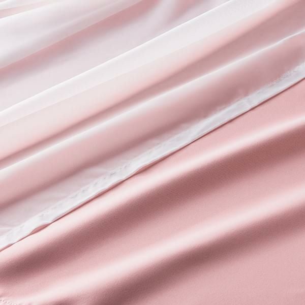 まるでお城のプライベートルームに迷い込んだかのような、宮廷ドレスを思わせるリュクスなデザイン。甘くなりすぎない落ち着いたピンクのドレープに、柔らかなホワイトのボイル生地を重ねることで、奥行きのあるフェミニンな表情を生み出しています。上部には貴婦人のドレスの襟元を思わせるボリュームフリルを、裾には贅沢に段を重ねたティアードフリルを施し、光が差し込むたびに窓辺をやさしくドラマティックに彩ります。